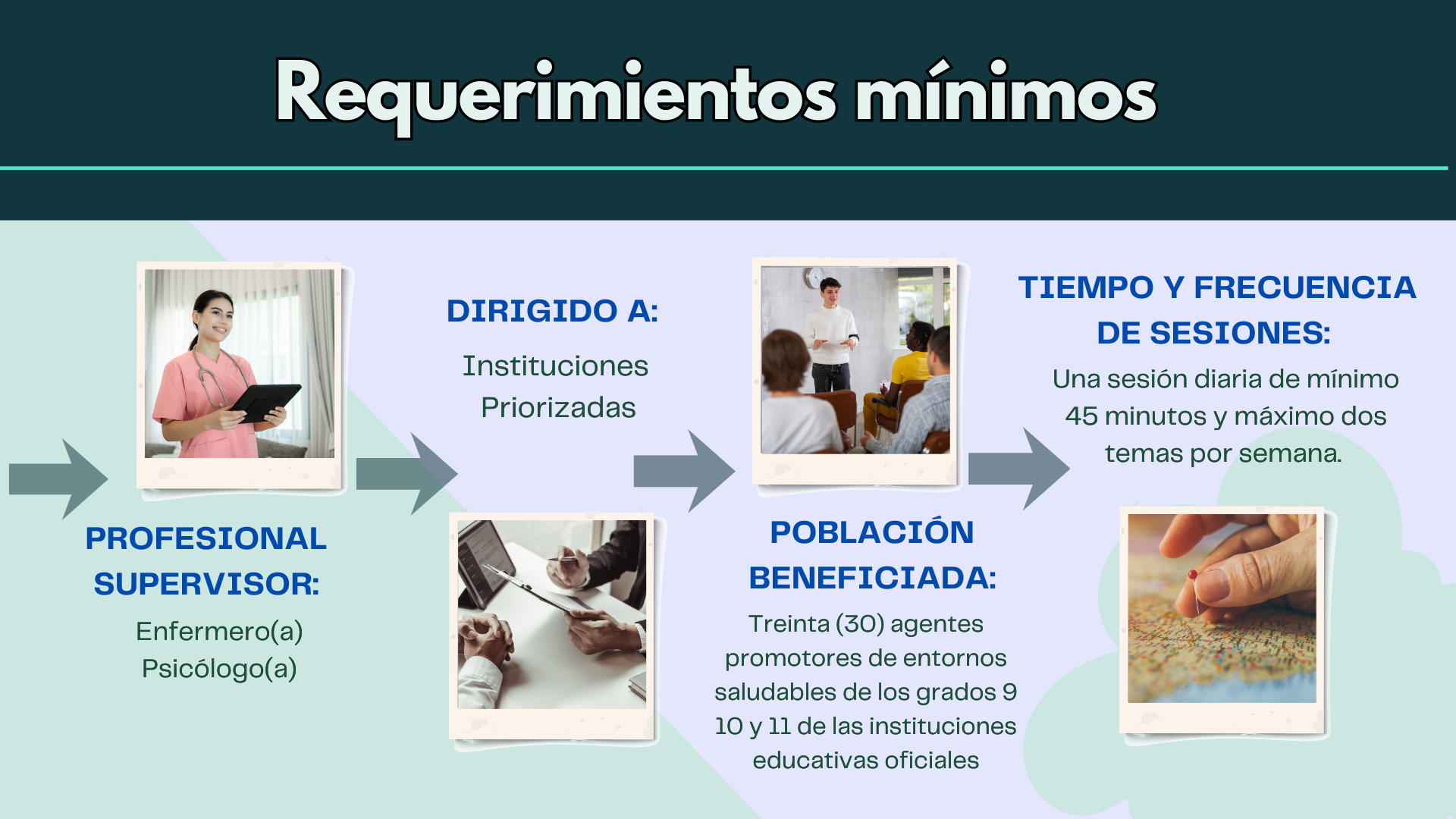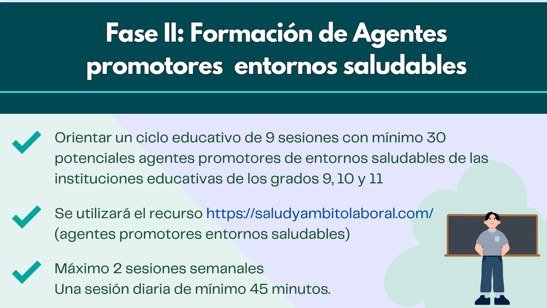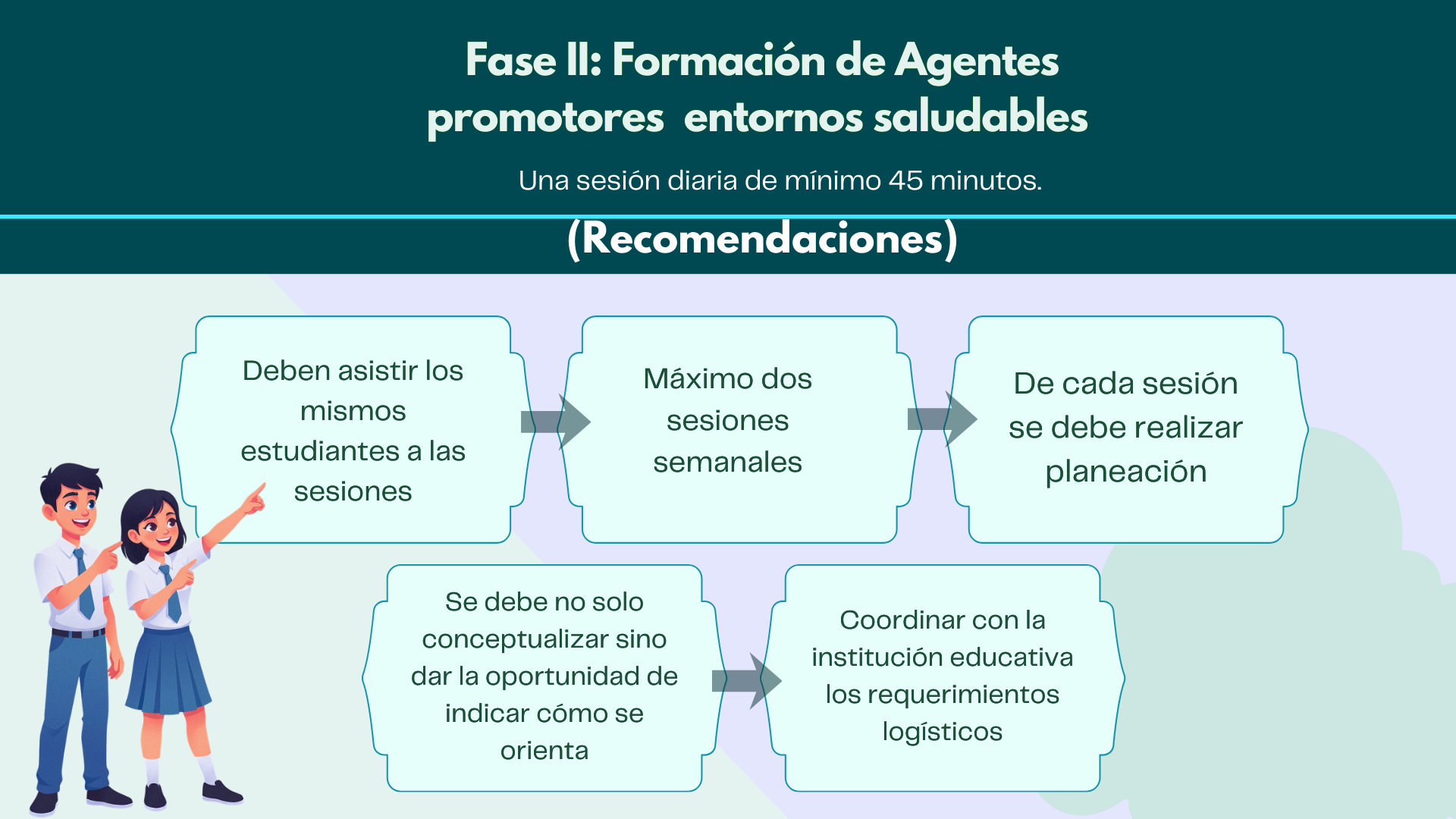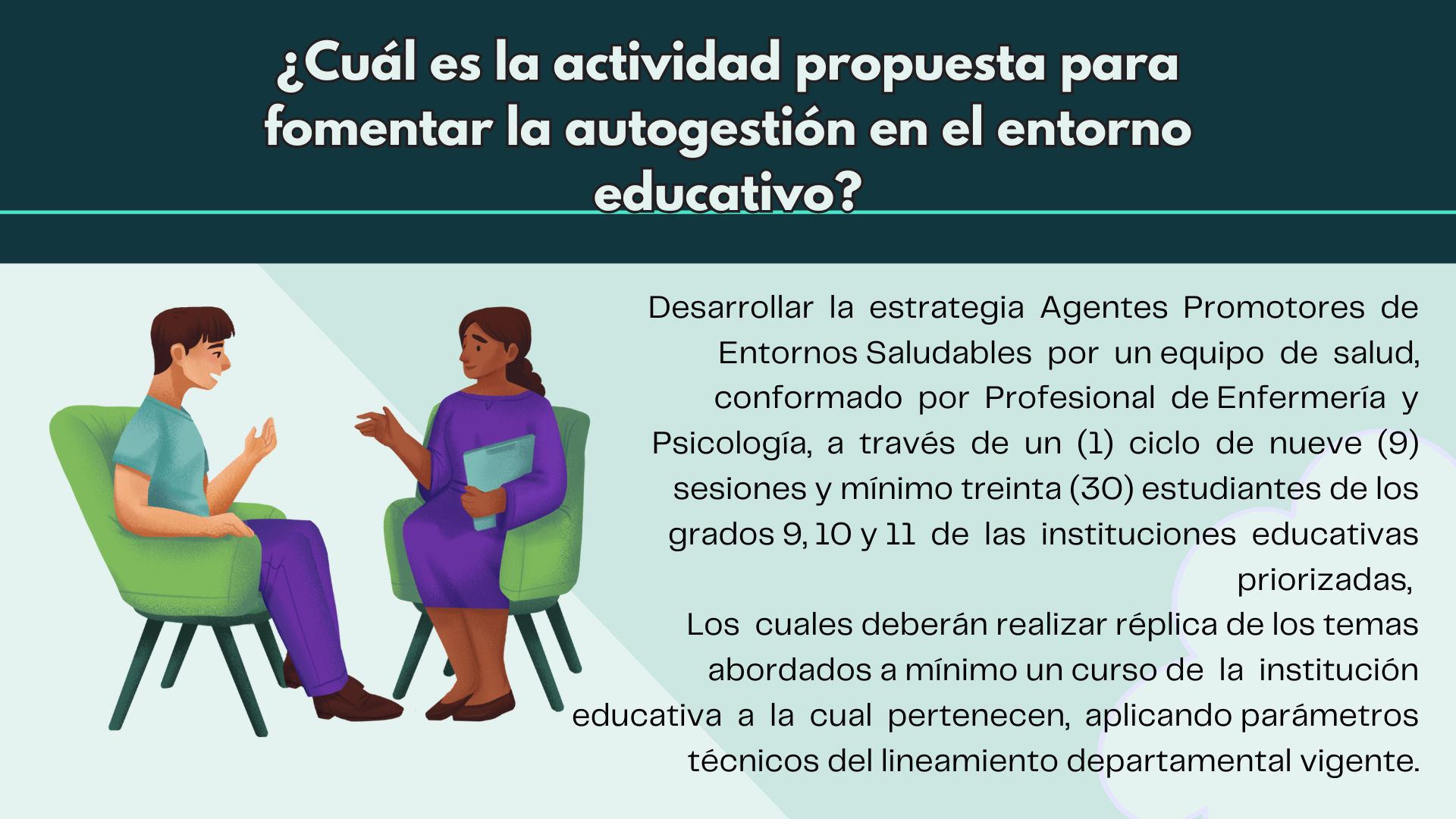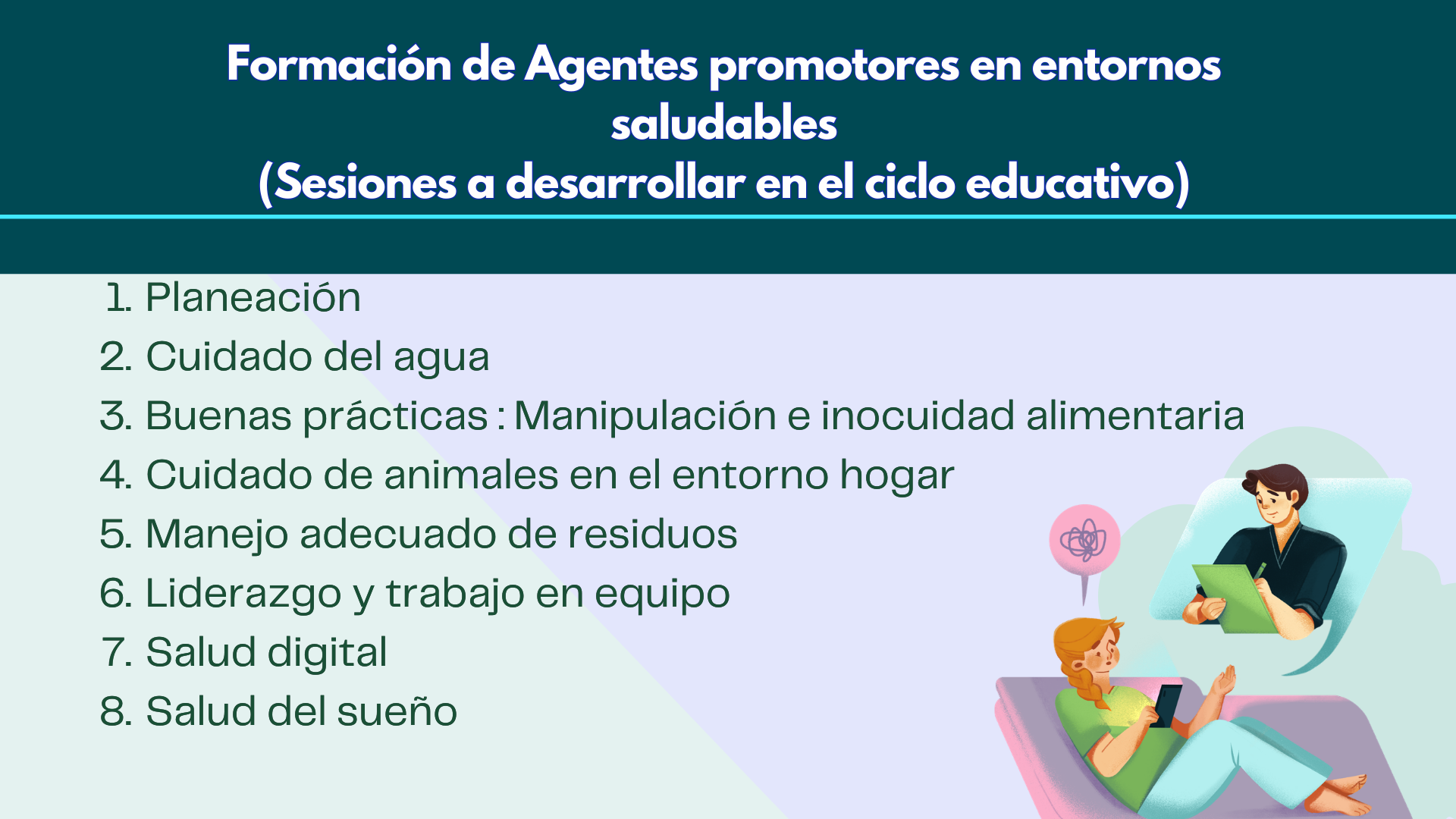 La estrategia Agentes Promotores de Entornos Saludables busca fortalecer el bienestar físico y mental de los estudiantes a través de un proceso formativo guiado por profesionales en enfermería y psicología. Durante un ciclo de ocho sesiones, los participantes adquirirán herramientas clave para promover ambientes saludables en sus instituciones educativas. Además, tendrán la misión de compartir estos conocimientos con sus compañeros, multiplicando el impacto de la iniciativa.